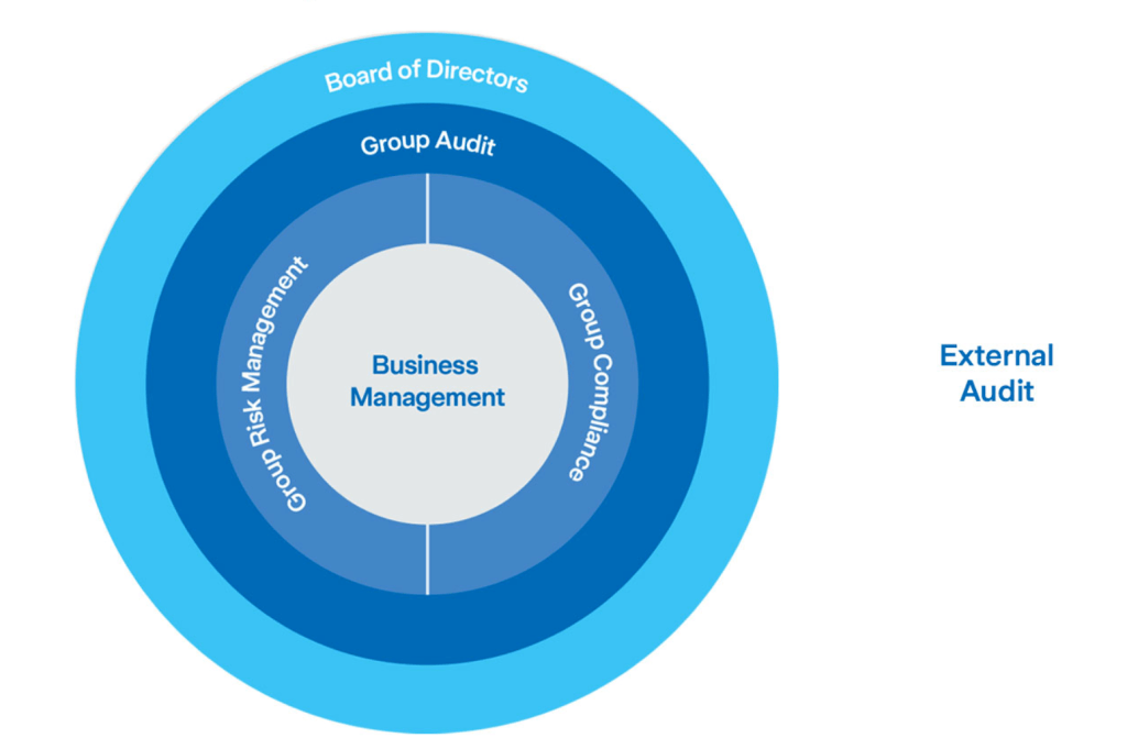 The first line of defense consists of business management and all functions except Group Risk Management, Group Compliance and Group Audit. The first line takes risks and is responsible for day-to-day risk management (i.e. risks are identified and monitored, mitigation actions are implemented and internal controls are in place and operating effectively).